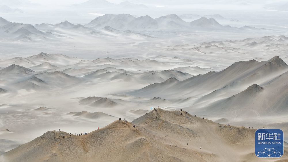 ↑2025年7月30日,游客在青海省海西蒙古族藏族自治州茫崖市冷湖镇黑独山景区游玩(无人机照片)。新华社记者 齐芷玥 摄