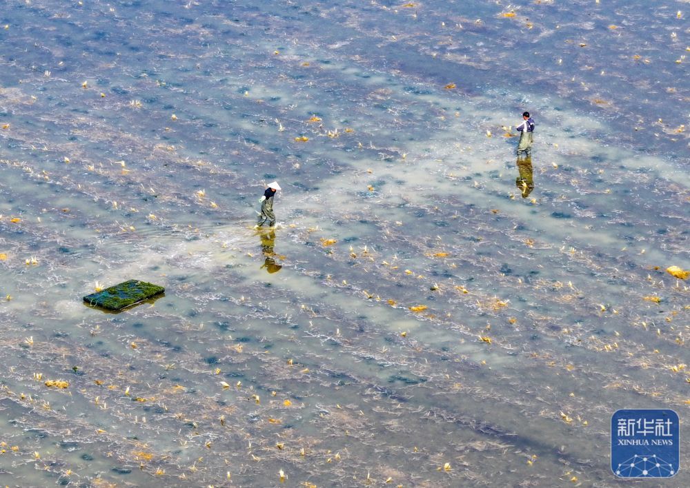 ↑2025年3月8日,农民在江苏盱眙龙虾国家级现代农业全产业链标准化示范基地的虾田里种植水草(无人机照片)。新华社发(顾继红 摄)