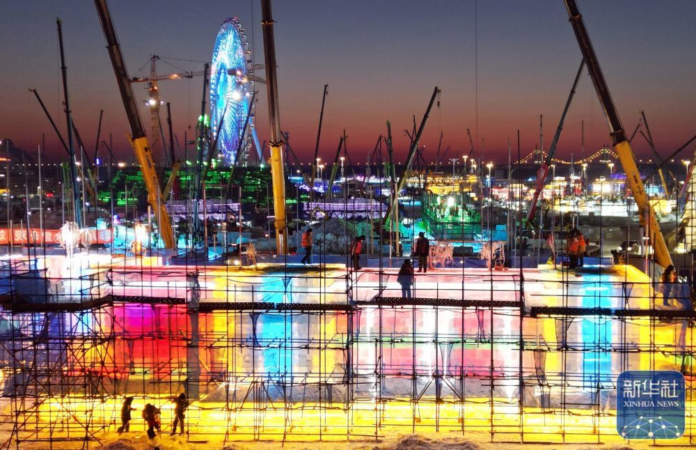 ↑2025年12月4日拍摄的哈尔滨冰雪大世界冰建施工现场(无人机照片)。新华社发(刘洋 摄)