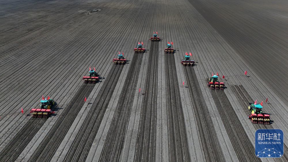 ↑2025年5月8日,在黑龙江双鸭山一旱田地块,大马力农业机械准备在黑土地上进行大豆播种作业(无人机照片)。新华社记者 王松 摄