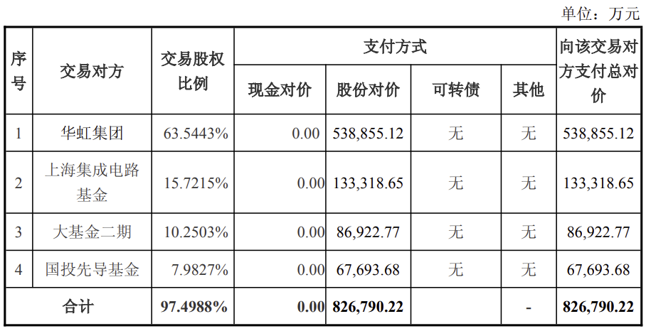 公告显示,华虹半导体拟以 43.34 元 / 股的价格,向华虹集团、上海集成电路基金、大基金二期、国投先导基金等 4 名交易对方合计发行股份 1.91 亿股,购买其合计持有的华力微 97.4988% 股权。标的资产评估值为 84.8 亿元,增值率为 323.59%,本次交易价格为 82.68 亿元。