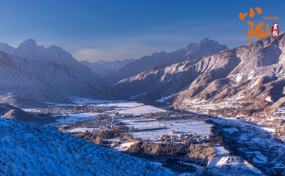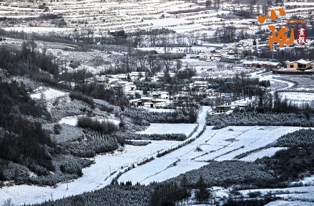 道路、沟壑、树木、村落,被皑皑的白雪所覆盖,呈现出一片“雪落山川白,美景入画来”的美丽景象。