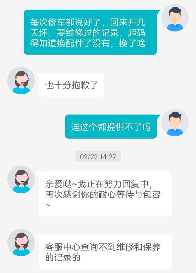 对于杨先生称车辆大小维修总计约七八次但手中仅持有两次维修单的情况,该负责人表示,经过查询,店内确实仅有两次杨先生车辆的维修记录。对此,记者联系到杨先生询问,杨先生称:4S店曾表示“三包内的维修不给单子”,现有的两张维修单还是自己向厂家投诉后4S店才提供的。随后他提供了车辆“第二次更换ESC总成”时与厂家客服沟通的截图,其内容显示:2025年2月22日,杨先生要求4S店提供维修记录,但未予提供,随后他向厂家客服反馈,仅得到“客服中心查询不到维修和保养记录,需向4S店咨询”的回复。