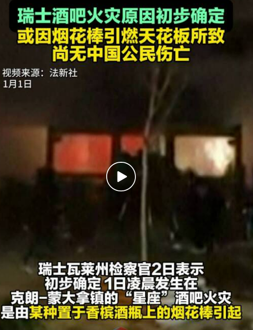 总台记者 杨春:同时,还有一个细节非常值得关注,当时酒吧里的顾客们大量燃放一种名为冷烟花的常见庆祝烟花,短时间内点燃了天花板,而在场者起初误以为这是一种别出一格的庆祝环节,未及时警觉。很快,大火熊熊燃烧,而人们却无处逃生。这场事故引发多方追问:为何小小的酒吧会在特殊时段涌入上百人?为何烟花爆竹能在室内大量燃放?相关监管环节为何存在漏洞?瑞士各级政府已表态将尽快查明事故真相,告慰逝者。目前,克朗-蒙大拿地区已设立禁飞区,瓦莱州宣布进入“紧急状态”,全力推进伤员救治与事故调查工作。
