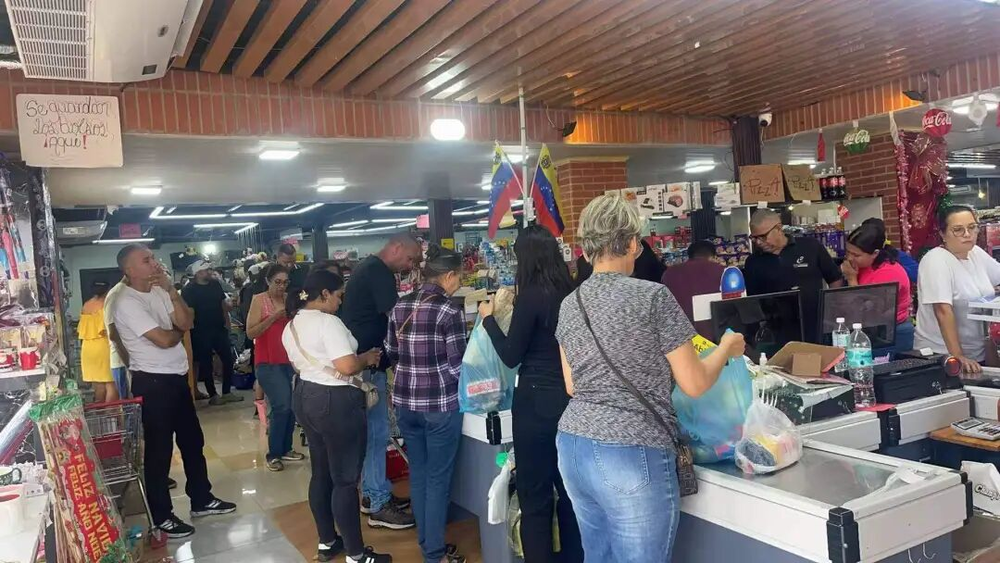 小林在委内瑞拉亲戚开的超市工作,所在地为bolívar省,尽管距离动荡的加拉加斯约600公里,但这里的本地人已经开始疯狂囤货。当地时间1月3日下午,小林所在超市的营业额较往日翻了10倍,600平方米的超市,囤货队伍排了40多米长,结账的地方,从这头排到那头,队伍拐弯又排了十多米。