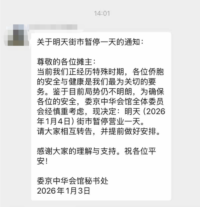 老黄是委内瑞拉当地的侨领(指当地华侨社群中具有影响力的人),住在Zulia省(苏利亚省),离加拉加斯有600公里。目前,这里跟平时没有区别,绝大多数商铺都开门营业。不过据他了解,“委京中华会馆”新街市群里,委京中华会馆秘书处已经宣布,1月4日街市暂停一天。