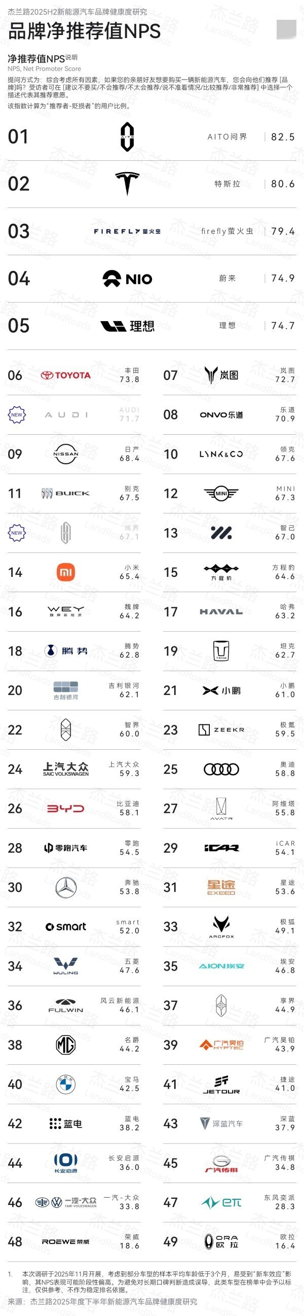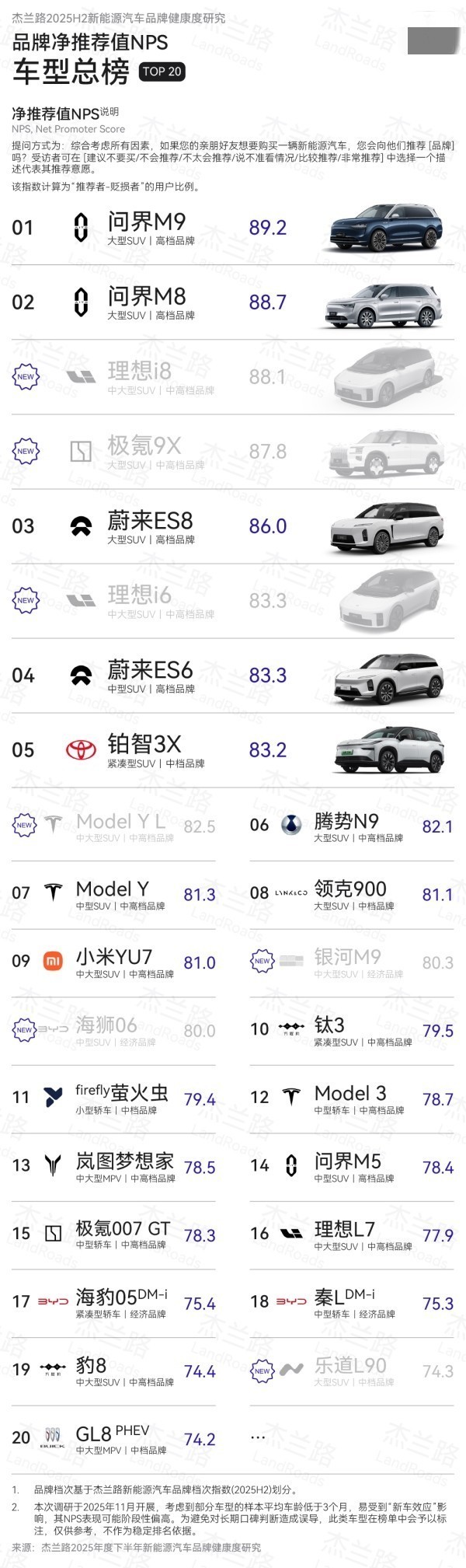 【CNMO科技消息】1月6日,杰兰路发布2025年度下半年新能源汽车品牌健康度研究 (NPS篇) 。NPS(净推荐值)是衡量用户总体满意度与推荐意愿的核心指标。CNMO注意到,问界品牌的NPS达到82.5,位居行业首位;问界M9和M8分别斩获净推荐值车型排名第一与第二。