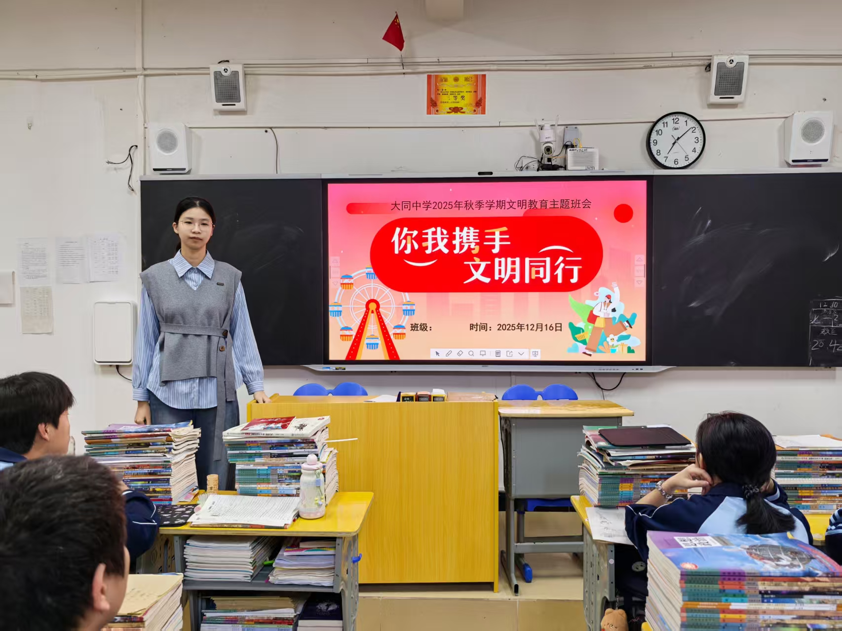 深化主题引领,筑牢文明思想根基。各学校立足校园主阵地,以主题班会为核心载体深化文明认知。大同中学、兴隆第一中学、万城小学等学校全覆盖开展“小手拉大手,共创文明城”“始于心,践于行,同心共建文明城”等主题班会,通过课件讲解、短片播放、案例分析等形式,系统阐释文明城市创建内涵与意义,引导学生认识自身作为城市未来建设者的责任。各校结合《中小学生守则》、校规校纪与社会公德,引导学生围绕课堂纪律、尊师重道、交往礼仪、就餐秩序、爱护公物、环境卫生、交通安全等话题展开讨论,制定班级文明公约,明确文明践行方向。