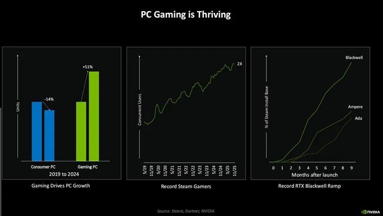 NVIDIA首先表示近年来PC游戏市场蒸蒸日上,根据统计,游戏笔记本在五年间的出货量提升了51%,并且Steam用户也提升了1倍。