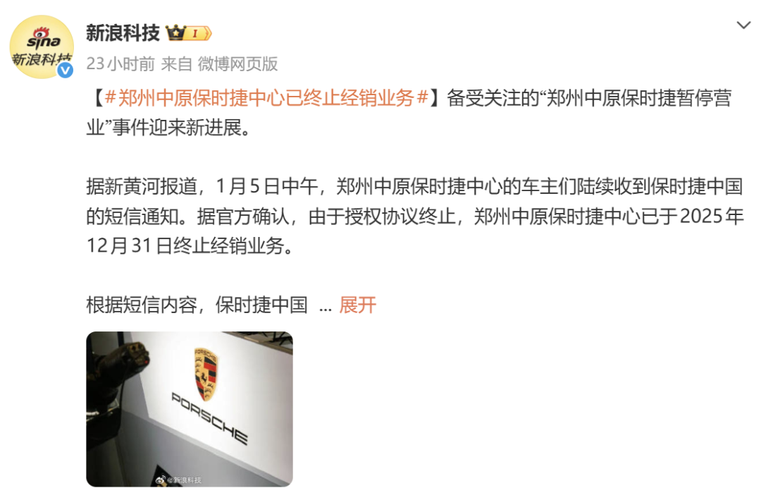 1月5日,郑州中原保时捷中心被传出已被移出保时捷品牌经销商网络。从网络曝光的保时捷中国向郑州中原保时捷中心车主发送短信通知的图片内容显示:由于授权协议终止,郑州中原保时捷中心已于2025年12月31日终止经销业务。