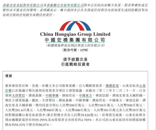 2023年12月,中国宏桥公告称,天津聚信、济南嘉汇、中信金融资产、济南君岳、中国东方、宁波信铝、济南宏泰及天铖锌铖一期均同意分别以5亿元、5.3亿元、5亿元、2.02亿元、5亿元、4亿元、3.01亿元及3000万元的对价认购宏拓实业新资本,累计对价合共为29.63亿元,目前合计持有宏拓实业约4.71%的股权。