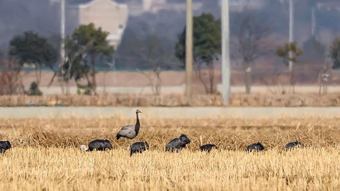 蓑羽鹤是鹤形目鹤科鹤属一种小型鹤类,为全球15种鹤中体型最娇小者。其特征为头部与颈部黑色,两颊具独特的白色长羽,如同披肩,故名“蓑羽鹤”。此次发现的蓑羽鹤正与一群白头鹤在农田中活动,其灰色体羽、黑色头颈、胸前黑色长羽以及耳后白色羽毛等特征,使其与身体黑色、头部白色的白头鹤差异显著。