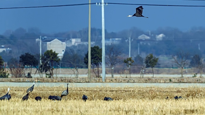 鉴于蓑羽鹤的常规迁徙路线并不经过安徽,因此它在安徽省非常罕见。2019年12月曾有1只佩戴GPS追踪器的蓑羽鹤途经阜阳,2020年12月6日,巢湖鸟类生态摄影师夏家振曾在牛角大圩拍摄到一只蓑羽鹤。而此次之所以能在枞阳记录到它,虞磊进一步分析到:“应该是这只蓑羽鹤在迁徙时误入了白头鹤群体,跟随白头鹤群飞到了安徽,因此它是一只‘迷鸟’。”