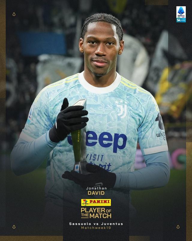 官方消息,乔纳森-戴维当选萨索洛对阵尤文图斯一役全场最佳。