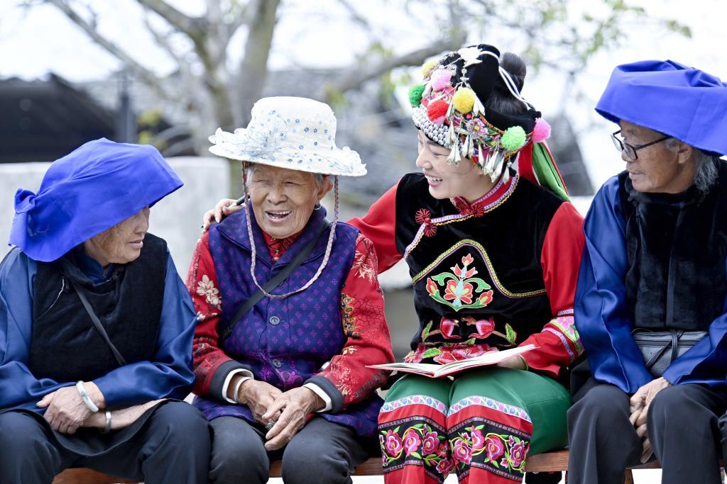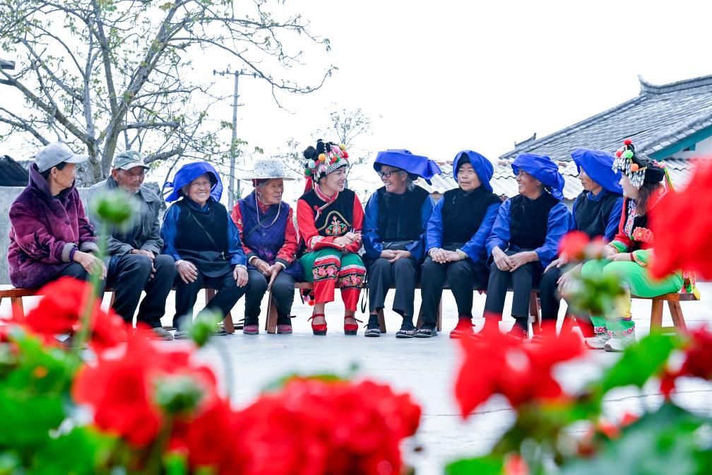 ↑2025年3月18日,鲁丽华(右二)在南涧彝族自治县无量山镇新政村幸福小院给彝族老人讲解养老政策。