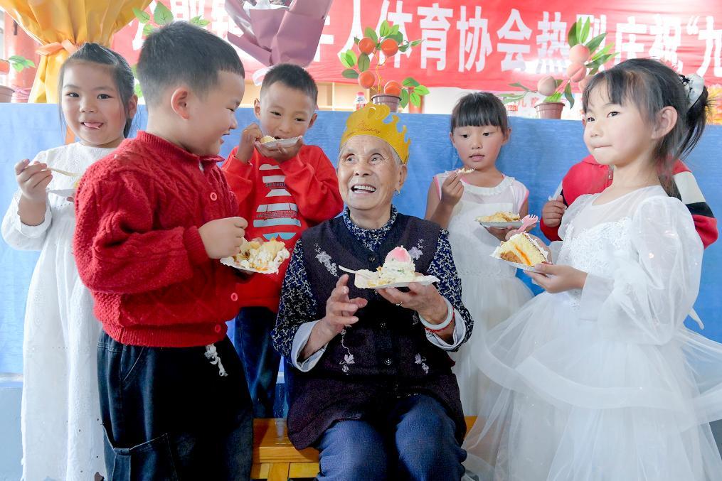 ↑2025年10月28日,在南涧彝族自治县公郎镇公郎村幸福小院,小朋友和老人一起庆祝重阳节。