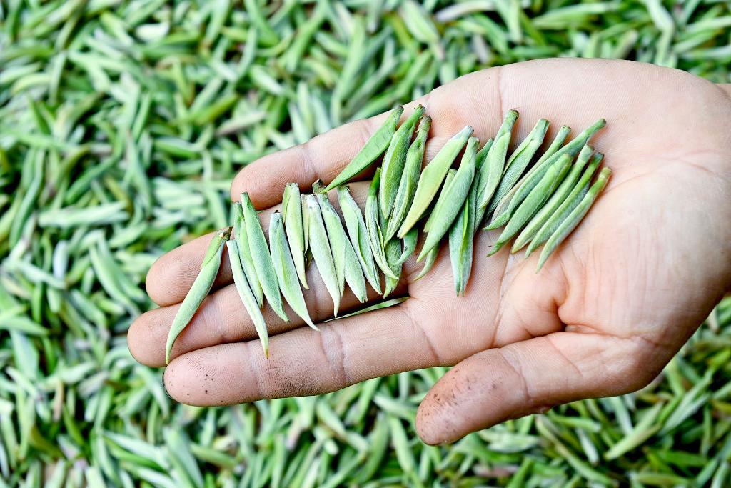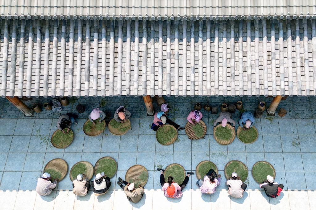 ↑2025年3月12日,南涧彝族自治县公郎镇北纬25度茶庄园的工人在分拣采摘回来的白茶。