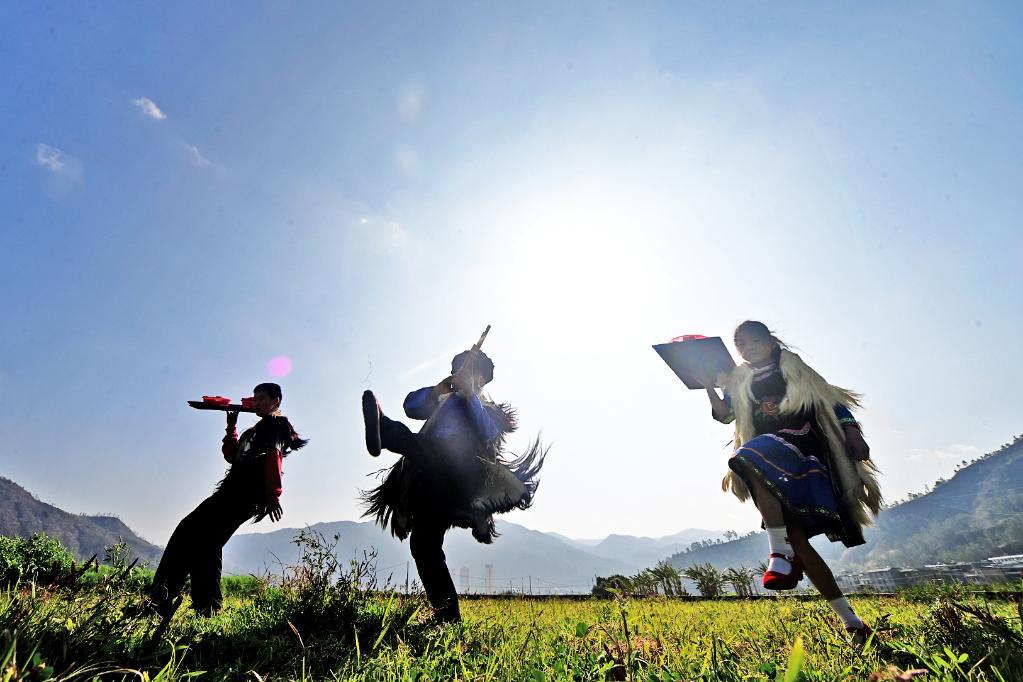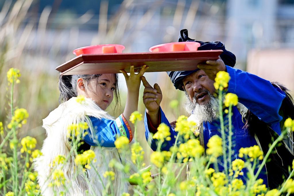 ↑2025年2月5日,南涧彝族跳菜省级非物质文化遗产代表性传承人阿本枝(中)给孙辈传授跳菜技艺。