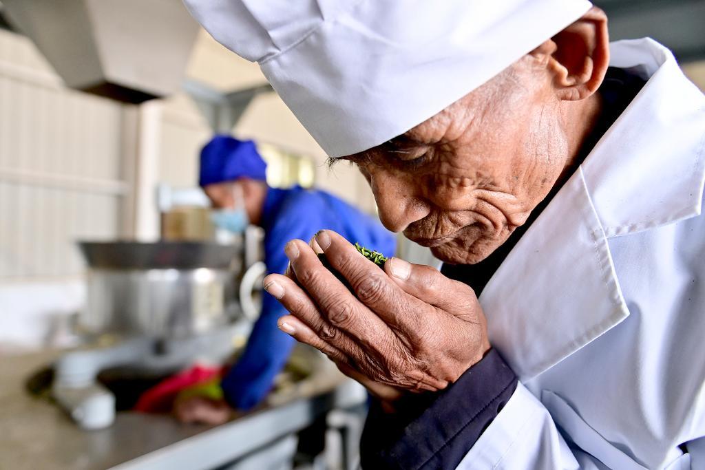 ↑2025年4月4日,李正林在检查茶叶香气。
