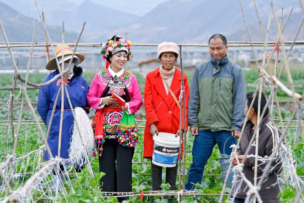 ↑2025年3月19日,鲁丽华(左二)在南涧彝族自治县南涧镇杨免庄村蔬菜种植田给群众讲解惠农、强农、富农政策。