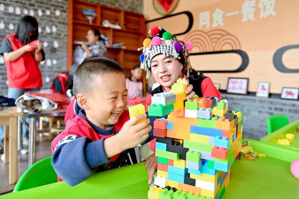 ↑2025年5月2日,在南涧彝族自治县南涧镇西山村幸福小院,小朋友学习堆积木。