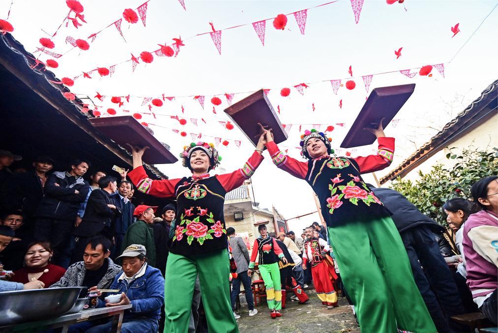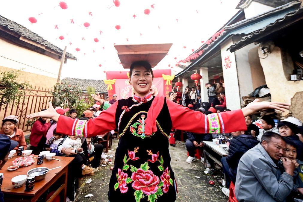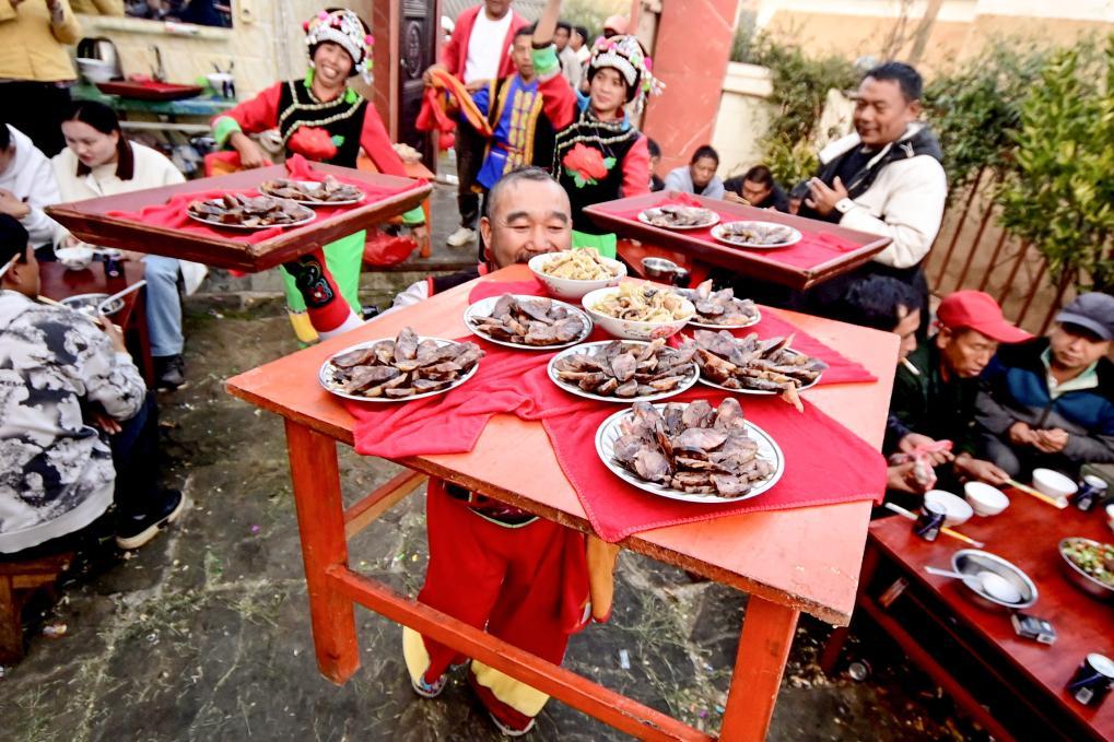 ↑2025年2月7日,跳菜表演者在南涧彝族自治县宝华镇拥政村一农户家婚礼上表演。
