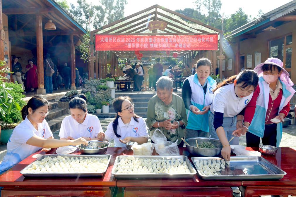 ↑2025年10月29日,在南涧彝族自治县南涧镇西山村幸福小院,志愿者给老人包饺子。