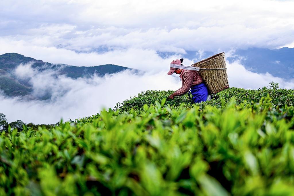 ↑2025年3月21日,茶农在南涧彝族自治县公郎镇罗伯克茶场采摘春茶。