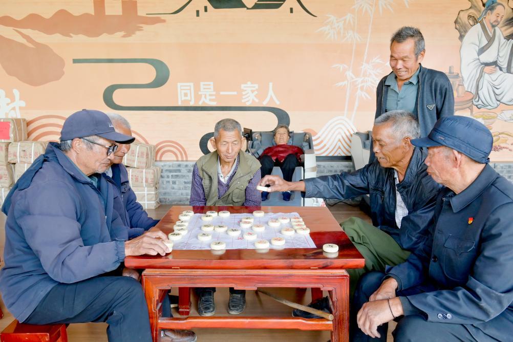 ↑2025年10月29日,老人们在南涧彝族自治县南涧镇西山村幸福小院下象棋。