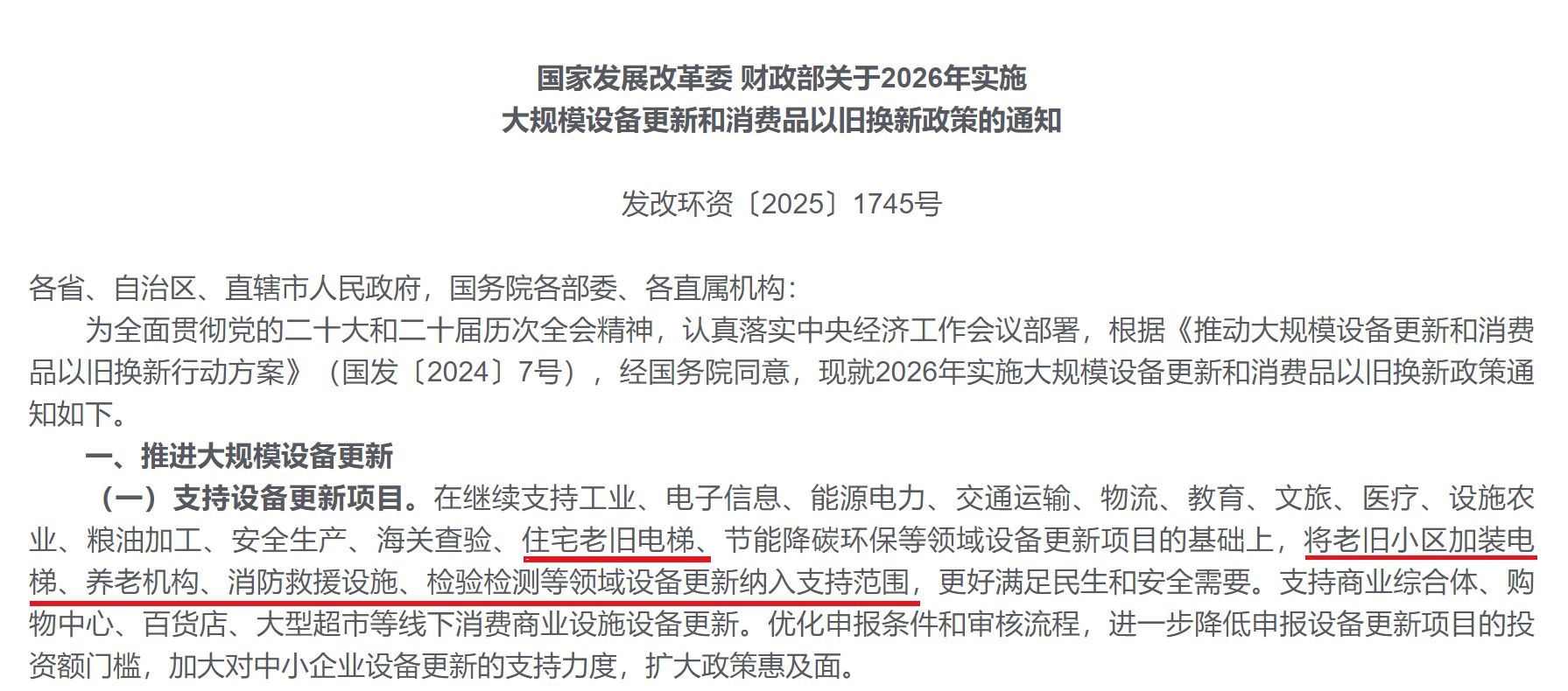 在总体延续2025年支持范围的基础上,主要增加三方面更新补贴,其中就包括在民生领域增加老旧小区加装电梯项目。补贴标准也更加精准,在设备更新方面,住宅老旧电梯更新补贴也由原来的定额补贴,调整为按电梯层(站)数分档差异化补贴。