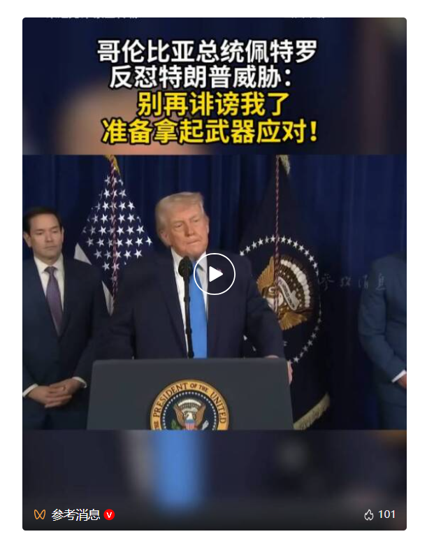佩特罗1月5日在社交媒体发文喊话特朗普“别再诽谤我了”。而面对特朗普的威胁,他表示准备“拿起武器”应对。