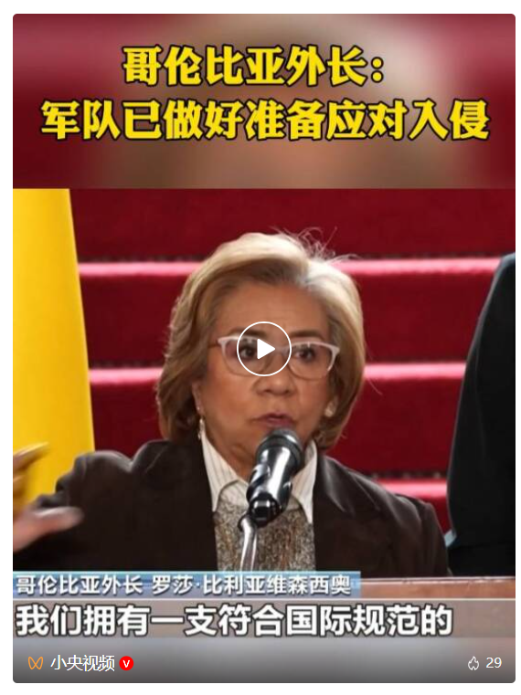哥伦比亚外交部长罗莎•比利亚维森西奥表示,如果美国对哥伦比亚发动侵略,哥伦比亚军队已做好准备保卫国家和人民。此外,比利亚维森西奥指出,唯有委内瑞拉人民才能基于其主权决定自己的命运。对于美方所谓将组建一个工作组“管理”委内瑞拉,哥伦比亚“反对殖民主义式的管理”。