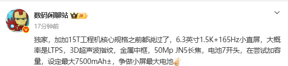 1月7日,数码博主@数码闲聊站 爆料称,一加15T将配备6.3英寸小直屏,预计采用LTPS材料,支持165Hz刷新率和3D超声波指纹,机身采用金属中框,后置5000万像素JN5长焦镜头,电池设定最大为7500mAh左右,争取做最大电池的小屏手机。