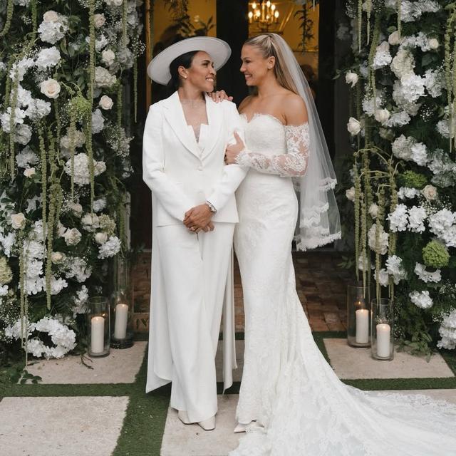 现年39岁、曾六次荣膺“世界足球小姐”的玛塔,身着一套由巴西进口面料定制而成的白色礼服。这套由西裤、西装外套、衬衫及宽檐帽组成的着装,彰显了她的个人风格与家乡情怀。仪式中,玛塔由母亲特雷莎-达-席尔瓦牵手步入仪式区,成为全场最动人的时刻之一。28岁的卡里耶-劳伦斯则选择了传统的审美风格,身披拖地长纱,穿着一件剪裁经典的白色婚纱。