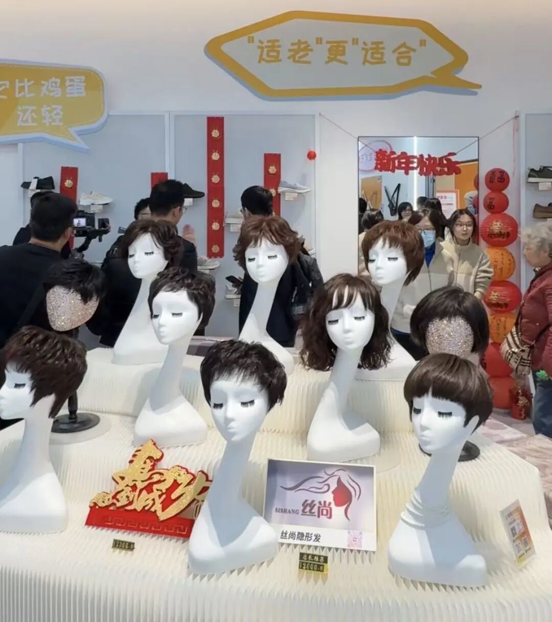 假发企业在开幕集市上请他们来了两天,后来有老人说,我新闻里看到,很想买,于是我们又把假发展位许愿许回来了。