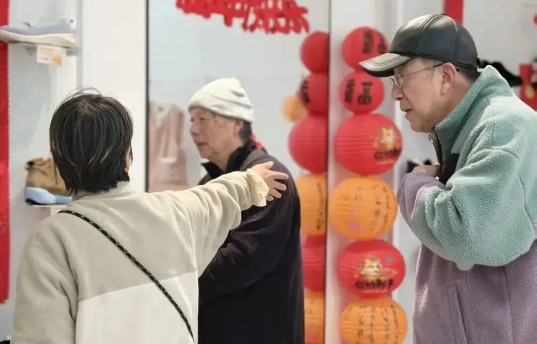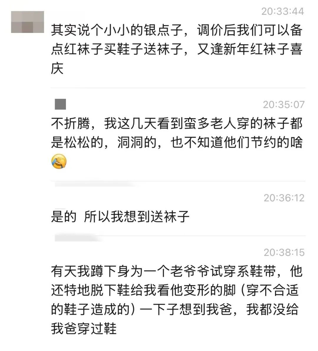 工作人员在日常服务中,也主动观察、关心老年群体,不断加码服务内容。在帮老人试穿老年鞋的过程中,有员工就在工作群里主动提出,备一些纱线厚实的红袜子送给购鞋老人作为新年伴手礼。