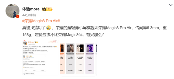 【CNMO科技消息】1月8日,CNMO注意到,荣耀商城官方微博发布了一条“#荣耀Magic8 Pro Air#”话题标签的帖子,并在海报图中加入“荣耀Magic8 Pro Air”的文字,正式确认了这款传闻中“既Pro又Air”新机的官方命名。