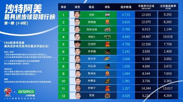 北京时间1月8日,CBA官方公布了联赛第1-9轮最具进步球员排名,广州队球员徐昕排名第一位。