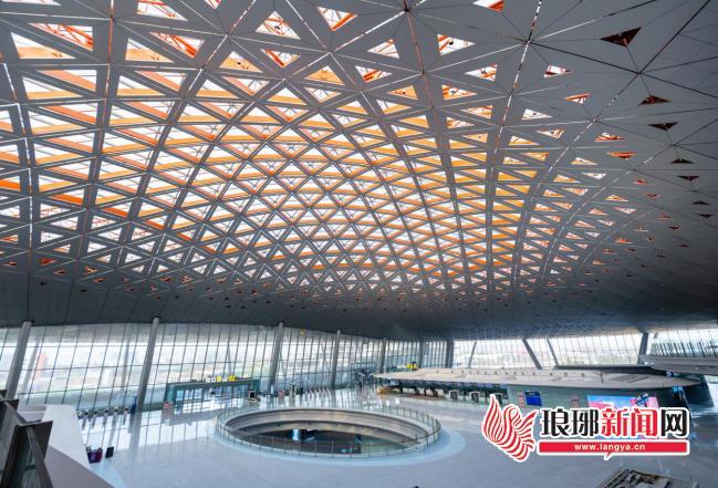 步入大厅,场景令人震撼:层高超过10米的穹顶,由大面积透光材料构成,阳光倾泻而下,整个大厅通透明亮,显得非常恢宏大气。新航站楼面积10.06万平方米,是老航站楼的6倍,可保障年旅客吞吐量1200万人次的出行需求。