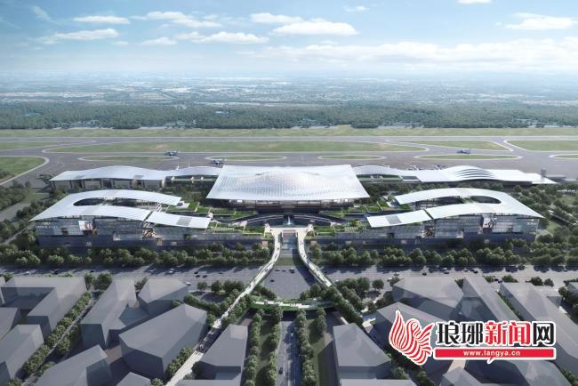 车辆驶入机场高架路,远远便看见一个气势恢宏的建筑——银色屋顶两只尖角扬起,如飞鸟展翅,屋顶一轮红日冉冉升起,取的就是“日升启阳”的美好寓意。
