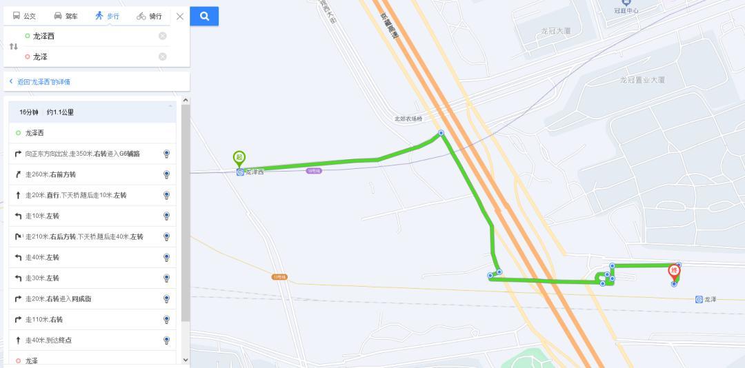 我们也用地图软件进行了测算,从18号线龙泽西站出站,前往13号线龙泽站,步行的距离大约1.1公里,耗时大约16分钟。骑行距离则约1.3公里,耗时约8分钟。这是站外的距离与耗时,没有计算站内的出站和进站时间。