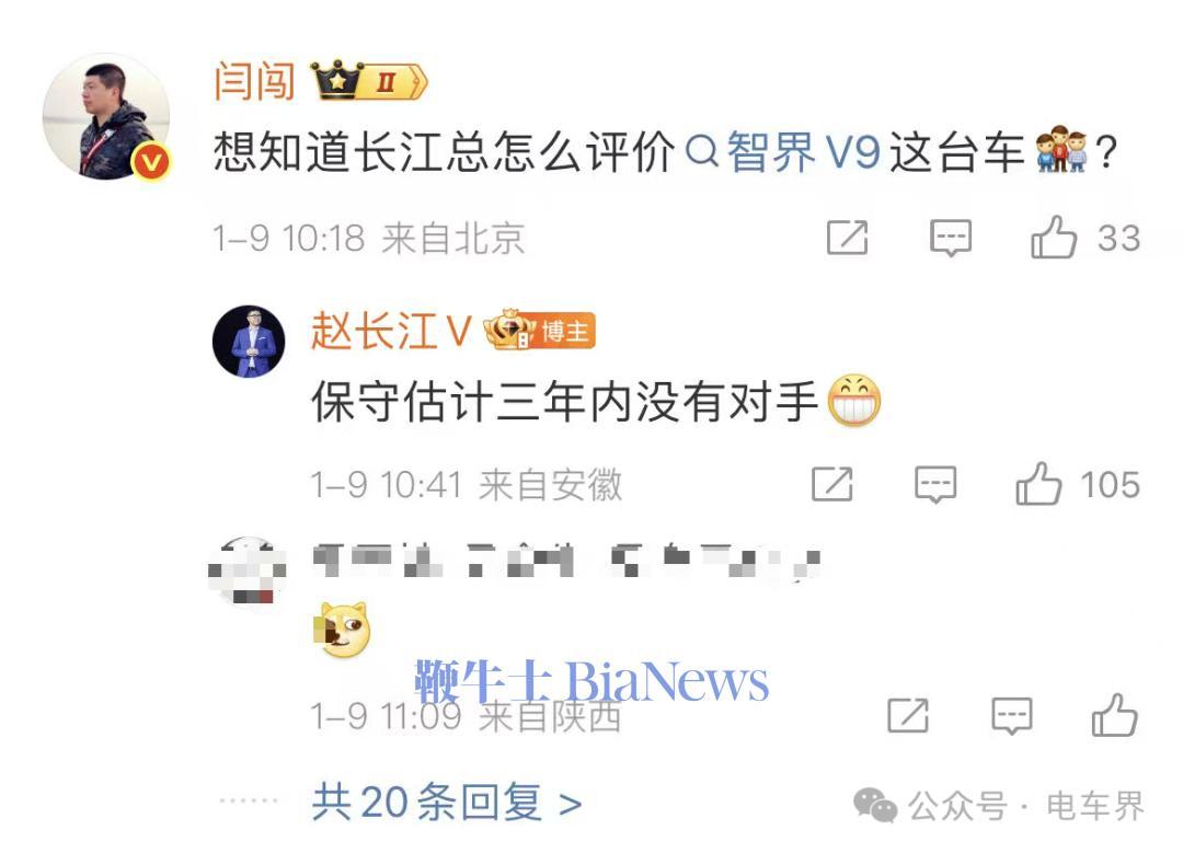 知名车评人闫闯在评论区问:想知道长江总怎么评价智界V9这台车?