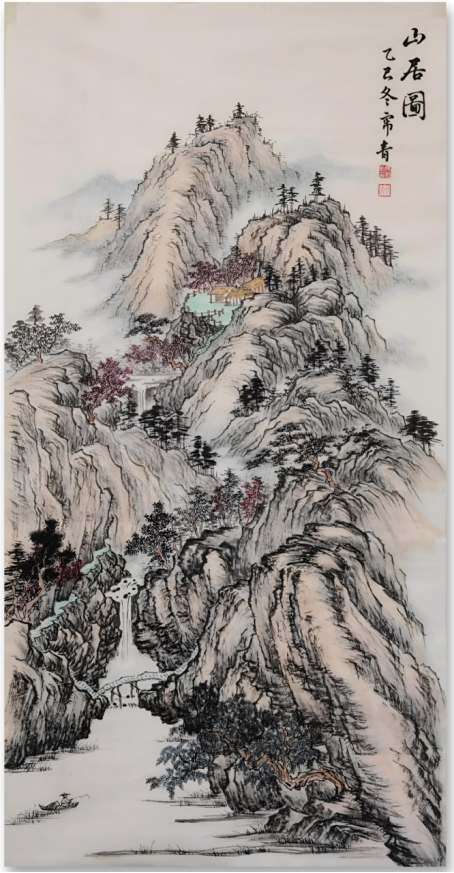 从作品整体来看,帘青的山水显然立足于传统文人画体系。她对历代山水画法度有着清醒认知,重视笔墨来历,也尊重章法秩序。山石不浮不躁,皴擦有度,墨色层层递进,却不追求强烈对比,而更偏向内敛的空间铺陈。画面中常见留白,却并非空置,而是为气息流转预留路径,使观者得以在画中“行走”。