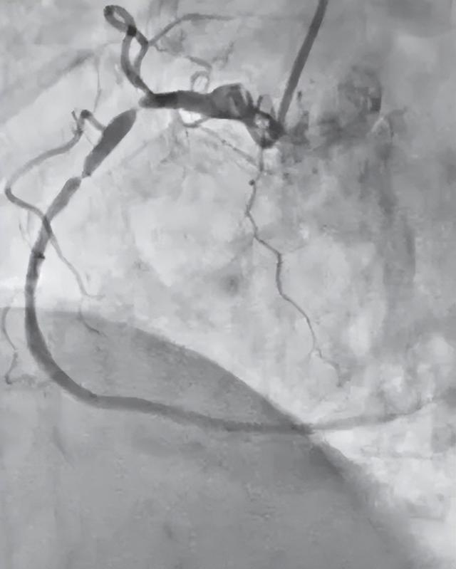 介入团队默契配合,凭借扎实的技术稳步推进手术,在局麻下精准穿刺血管,造影显示右冠状动脉近中段狭窄50-99%,远段狭窄40%,后降支近段狭窄85%。