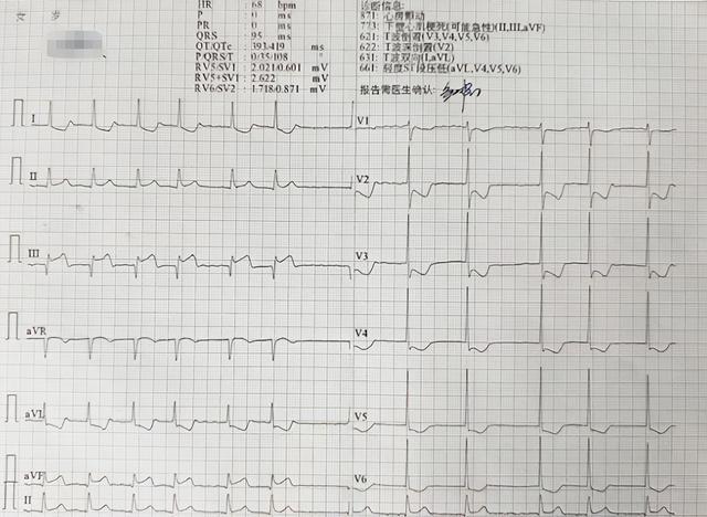 急诊心电图提示:心房颤动、急性下壁心肌梗死,伴V3-V6导联T波倒置(部分深倒置)、T波双向及轻度ST段压低。医疗团队迅速确诊急性心肌梗死,需立即介入手术开通堵塞血管,否则心肌将持续坏死危及生命。
