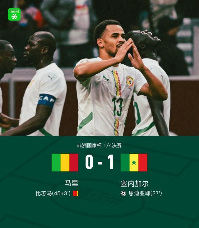 北京时间1月10日,非洲国家杯1/4决赛展开较量,马里迎战塞内加尔。比赛中,恩迪亚耶攻入全场唯一进球,为球队取得领先。上半场补时阶段,比苏马因累计两张黄牌被罚离场。凭借稳固的防守与高效的进攻组织,塞内加尔将优势保持至终场。最终,比赛结果定格在0-1,塞内加尔成功晋级。