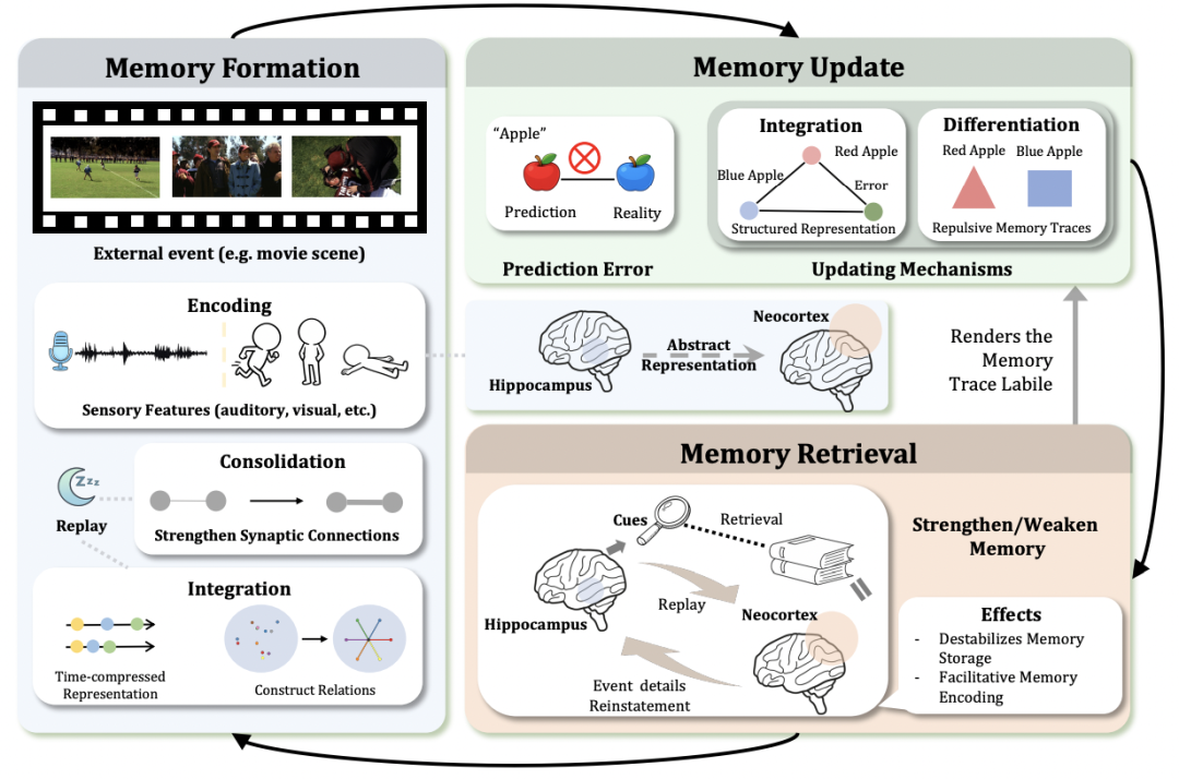 图 4. 认知神经科学中的记忆管理概述。该框架阐释了信息处理的动态循环,包括记忆形成、更新和检索,通过这个循环,长期记忆支持对外部环境的灵活适应。