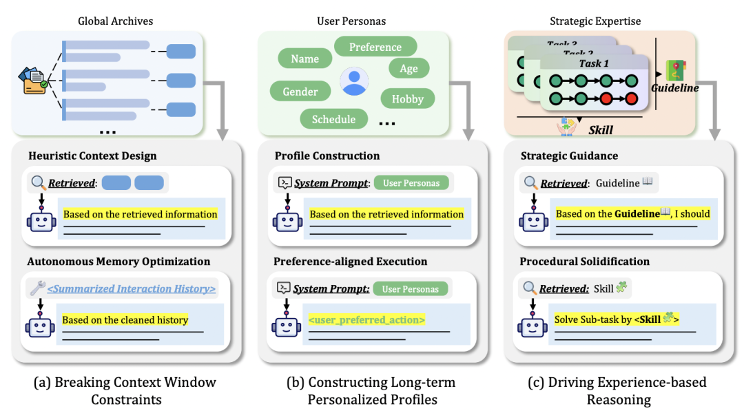 图 1. 记忆通过减轻上下文窗口限制、实现长期个性化以及驱动基于经验的推理来扩展 Agent 的能力。