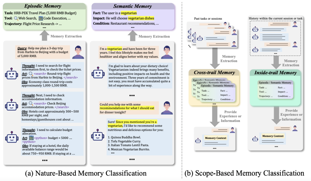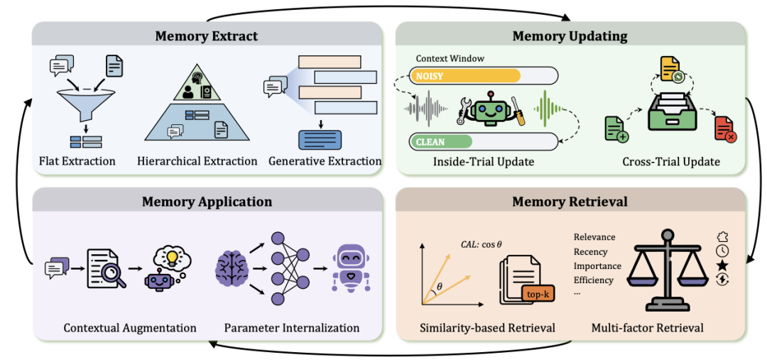 图 5. Agent 中记忆管理的概述。该框架形成了一个由记忆提取、更新、检索和利用组成的闭环管道,从而实现持久的经验调节和长期推理。