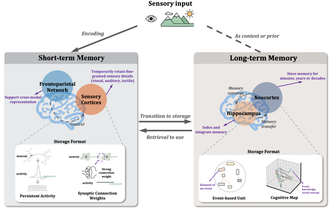 图 3. 认知神经科学中的记忆存储机制概述,包括短期和长期记忆的存储位置和存储格式。